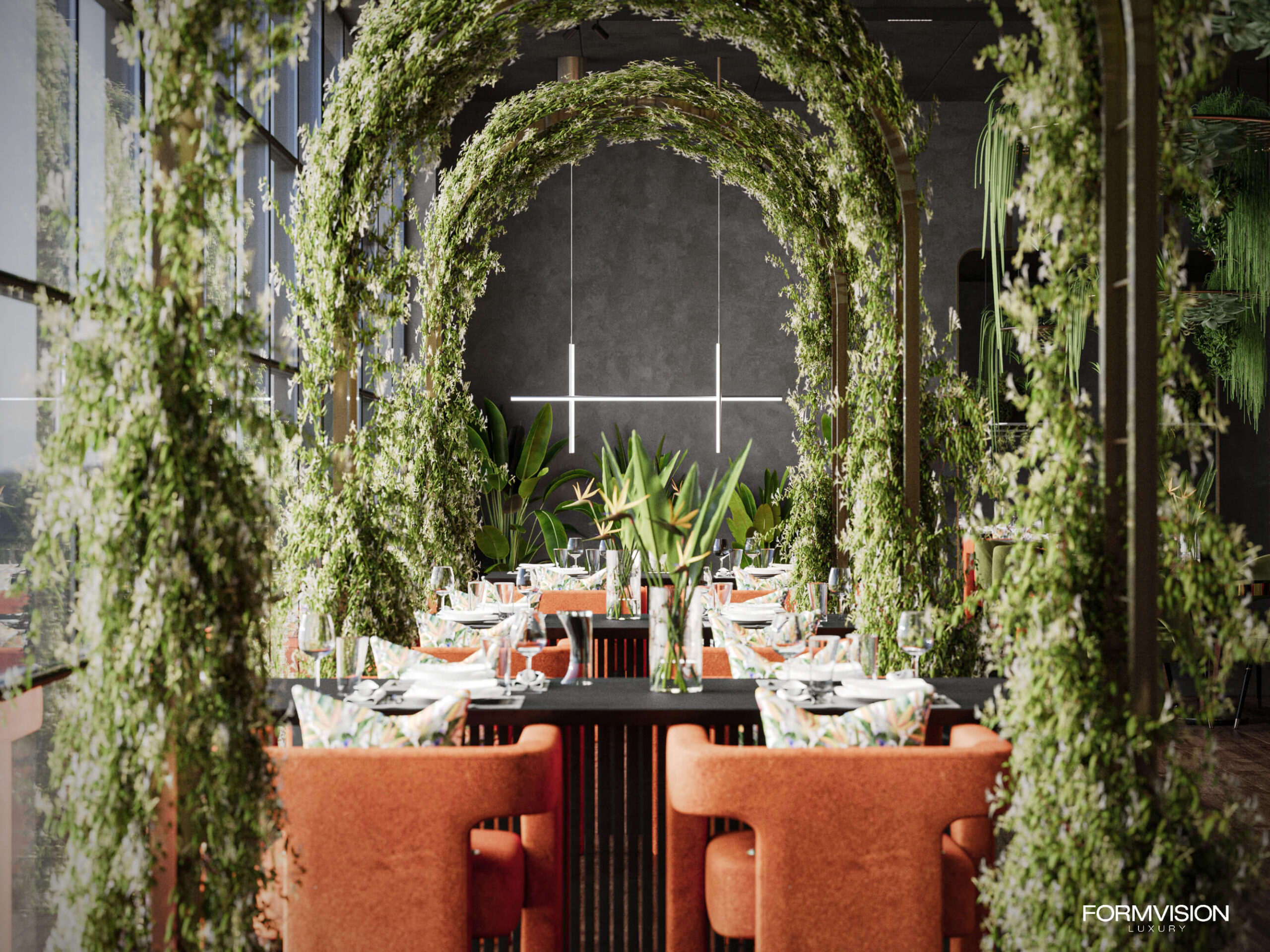 As part of the project, a signature restaurant was designed and realized to capture the essence of minimalist Alpine style. The interior emphasizes clean lines and natural materials, with exposed concrete surfaces complemented by lush greenery and carefully curated orange and green accents. The result is a refined yet inviting atmosphere, where understated luxury and nature-inspired design come together in perfect balance.