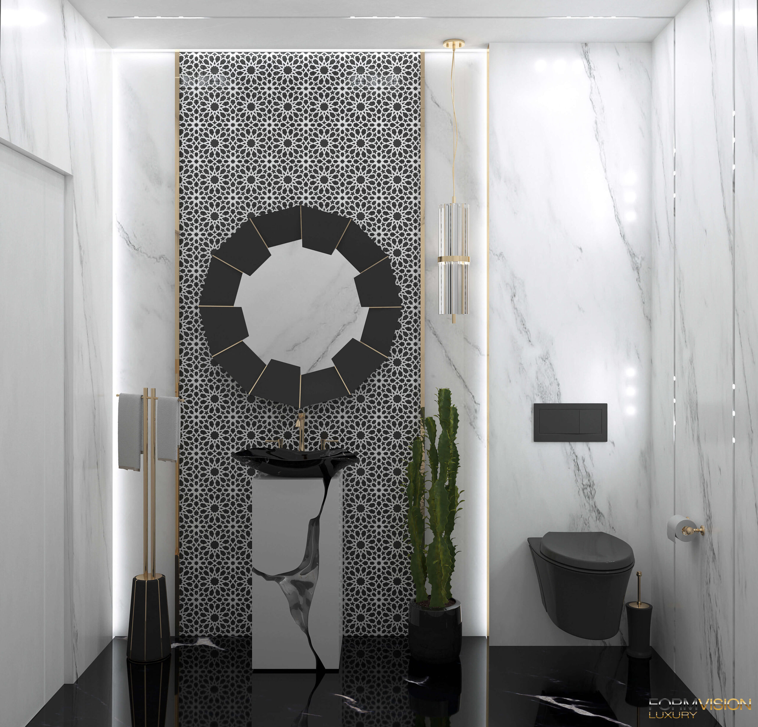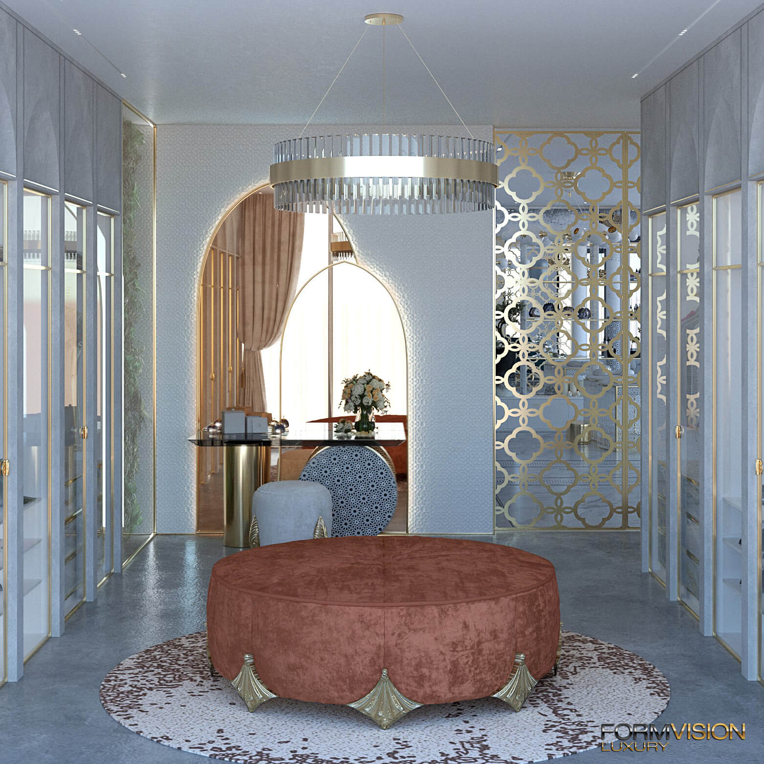 The Islamic arches in the living room serve not only as geometric décor but also as symbols of knowledge, hard work, and progress, turning the space into a cultural and educational base. Golden details enhance the luxury and modernity of the traditionally rich style, while Delightful Lamps, Coleccion Alexandra, and Boca do Lobo furniture create an ethereal atmosphere reminiscent of the tales of ‘Arabian Nights’.