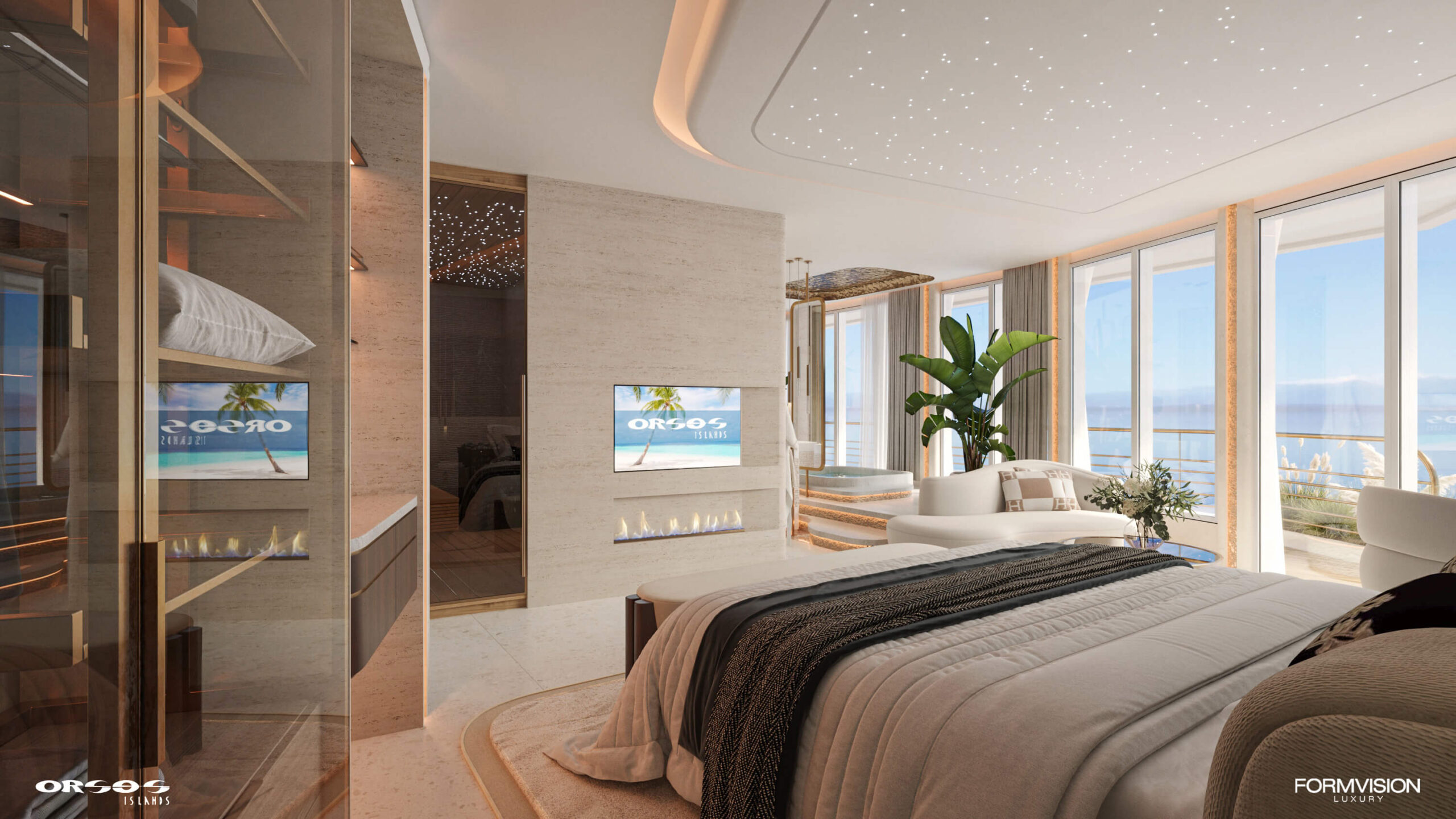 The bathroom area is a private wellness retreat, featuring a sauna, a Jacuzzi, and expansive mirrors that enhance the sense of space and light. Thoughtfully designed details, from sleek fixtures to textured surfaces, complement the panoramic water views, turning everyday routines into moments of indulgence. This harmonious combination of relaxation, elegance, and connection to nature defines the ultimate luxury living experience.