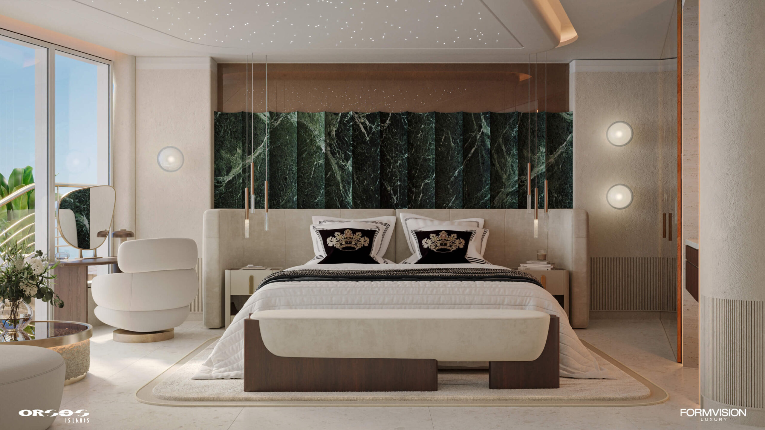 Our spacious suite is designed as a seamless blend of comfort and sophistication. The sleeping zone offers a serene retreat, featuring a luxurious bed, soft ambient lighting, and natural textures that invite relaxation. Every detail is curated to ensure a sense of tranquility, making the space a perfect haven to unwind while enjoying breathtaking views of the surrounding water.
