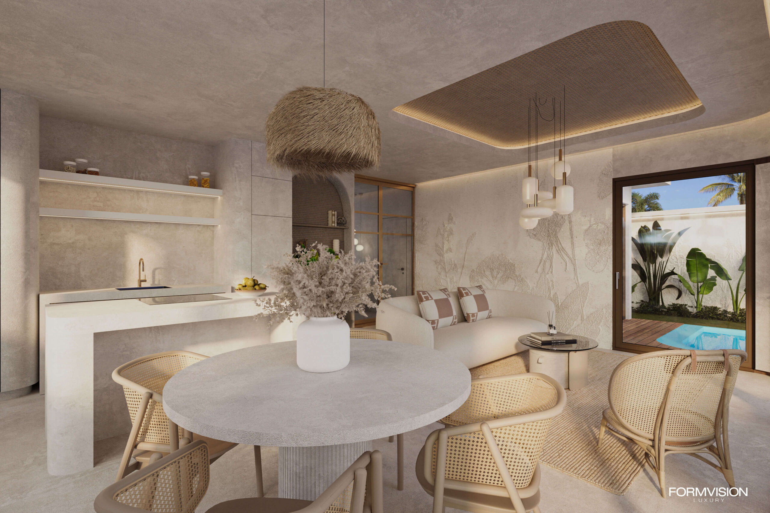 Outdoors, a generous terrace and pool area evoke a Bali-inspired aesthetic, with natural wood, soft textures, layered materials, and bespoke outdoor furniture that radiate refined island luxury. Sun loungers and carefully crafted furnishings provide the perfect setting to unwind, soak up the sun, and immerse yourself in the serene rhythm of Zanzibar’s coast.