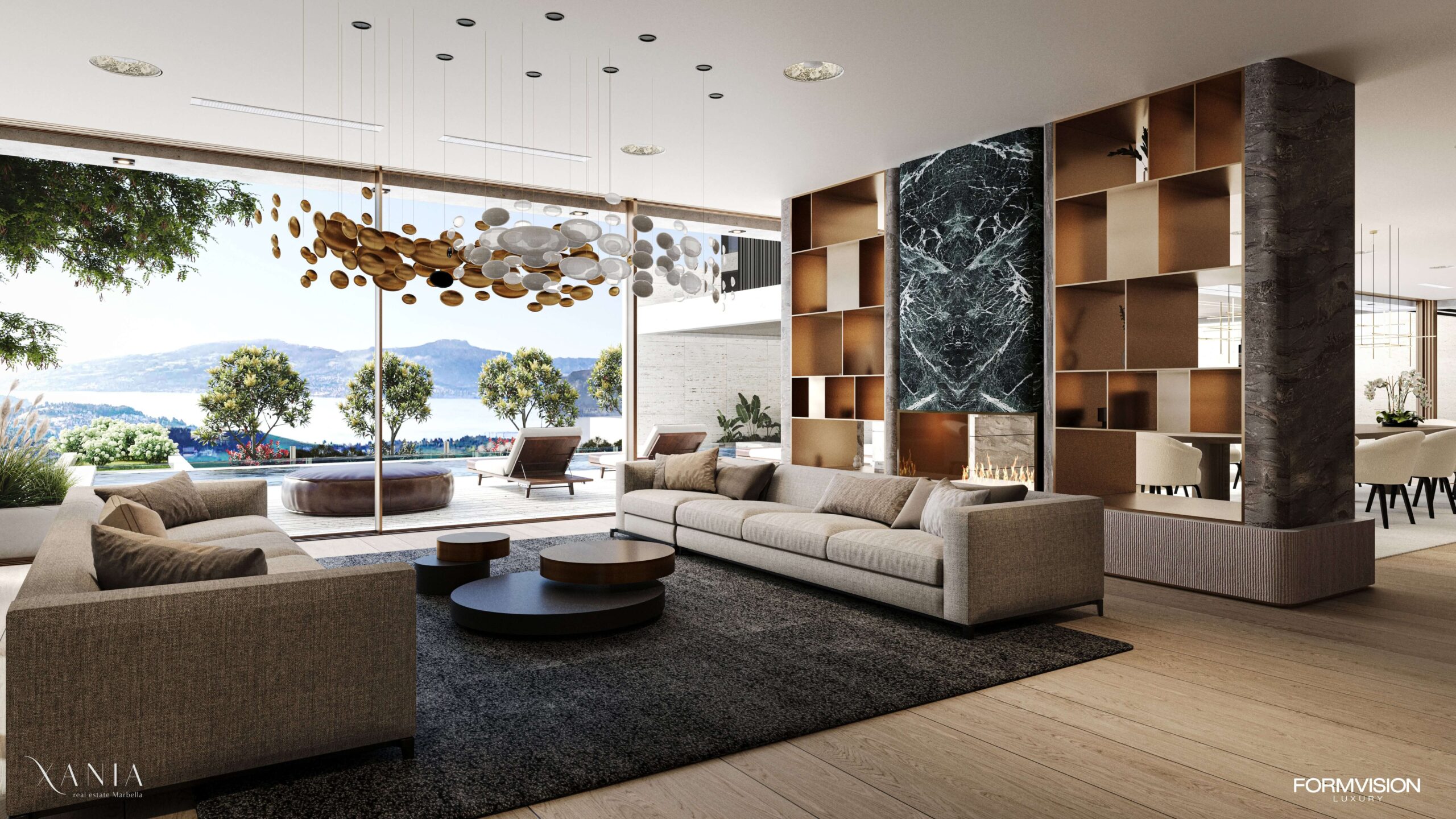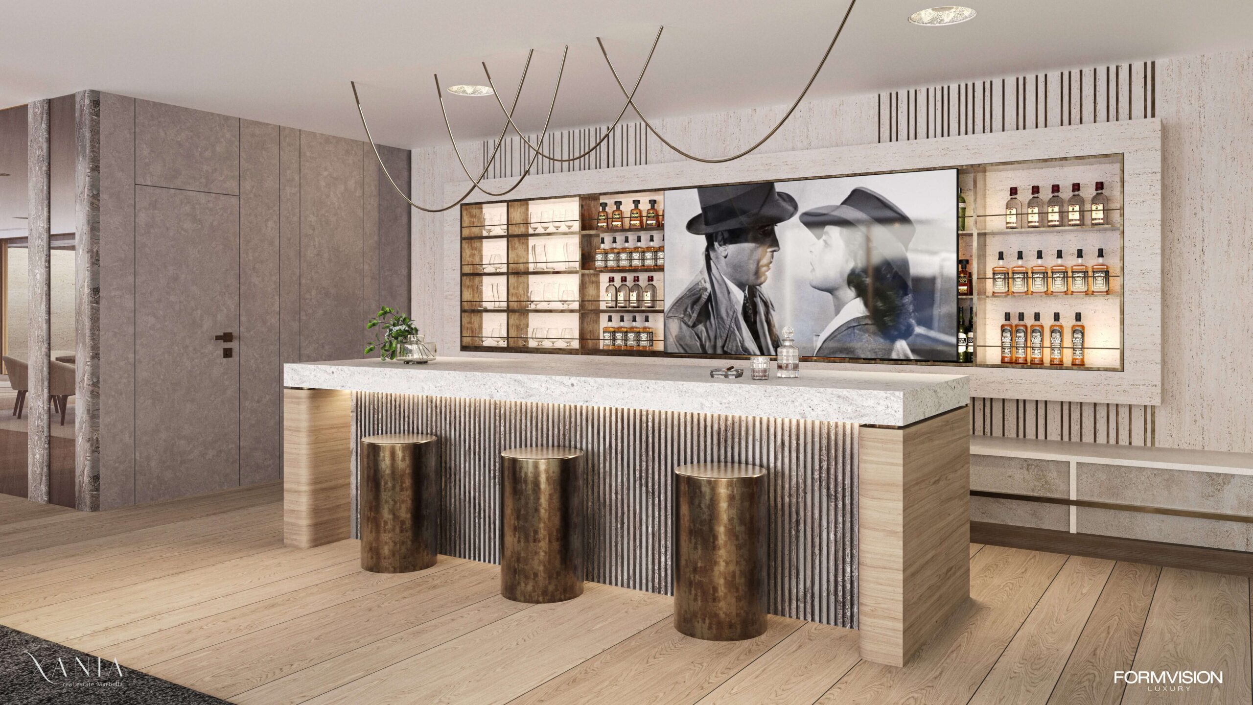 The idea for this villa was to create an open and airy space with the highest degree of privacy. Therefore, the outdoor seating area is shielded by a large wall with a water curtain, and panels are placed on the first floor. On the ground floor, we wanted to emulate the atmosphere of a party house. At the entrance, there is a bar with a seating area and a view of the pool. In the central part, there is an elevator that connects all the floors and a staircase core resembling the archetypal Palladian villa, with a dining room in the central part and an outdoor kitchen, half of which is inside and half outside, merging the interior with the exterior. Next to the dining room is the living room with a view of the car, a perfect example of what Formvision Luxury, automotive, and architecture together can create. We create a lifestyle. The car is positioned on a platform that provides access to the basement with parking spaces, a well-stocked wine cellar, and a captivating home cinema. This space is perfect for enjoying movie nights with friends and family or enjoying wine tastings.
